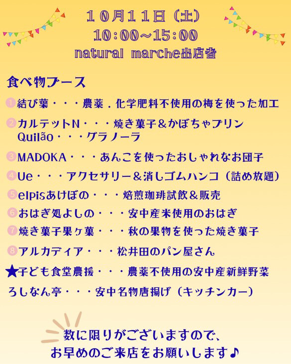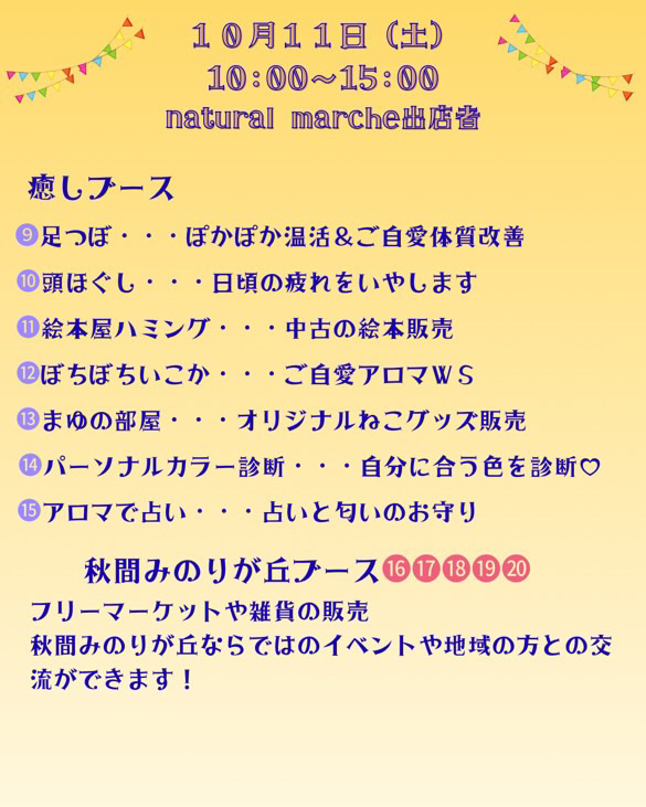 2025-09-18 マルシェ&マーケット開催のお知らせ Screenshot 10月11日(土)イノベーションスタジオ(旧コミュニティプラザ)にて今年2回目となりますナチュラルマルシェ主催のマルシェ&マーケットが開催されます。当日はみのりが丘区内の有志によるフリーマーケットも出展されます。どうぞお気をつけてお越しください。